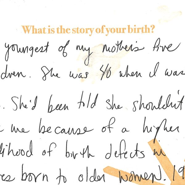 The youngest of my mother’s five children. She was 40 when I was born. She’d been told she shouldn’t have me because of a higher likelihood of birth defects in babies born to older women. 1978